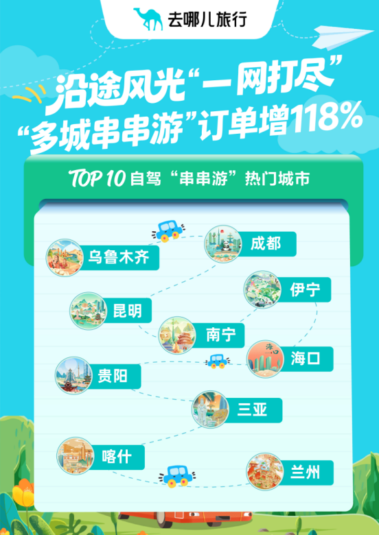 据去哪儿平台提供的数据,“五一”技巧预订2个及以上城市旅店的“多城串游”订单量增长118%,国内自驾游预订量同比增长近六成,东谈主均租车天数显赫拉长至5天,他乡租还车订单量同比增超1倍。TOP10自驾“串串游”热点城市是:乌鲁木皆、成都、昆明、南宁、伊宁、海口、贵阳、三亚、喀什、兰州。