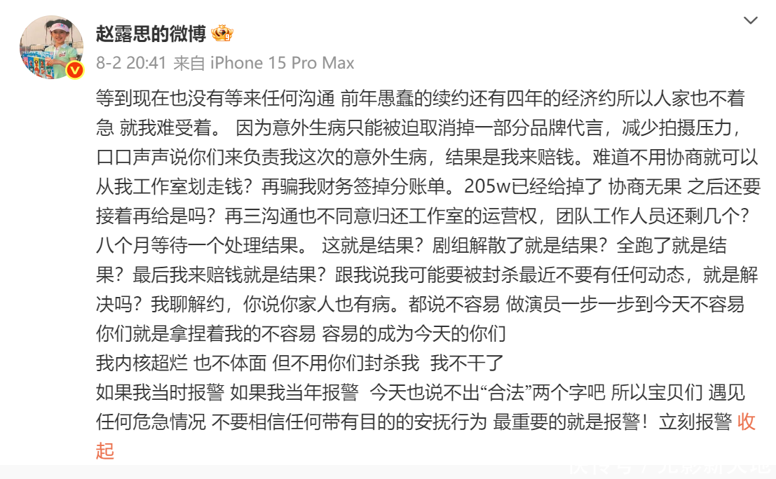 就说8月2日的发文。赵露想有流量、有影响力,但没诓骗好。第一次向经纪公司发难最遑急,因为最受存眷、影响力最大,背面再说什么,网友的存眷度就会大幅下落。