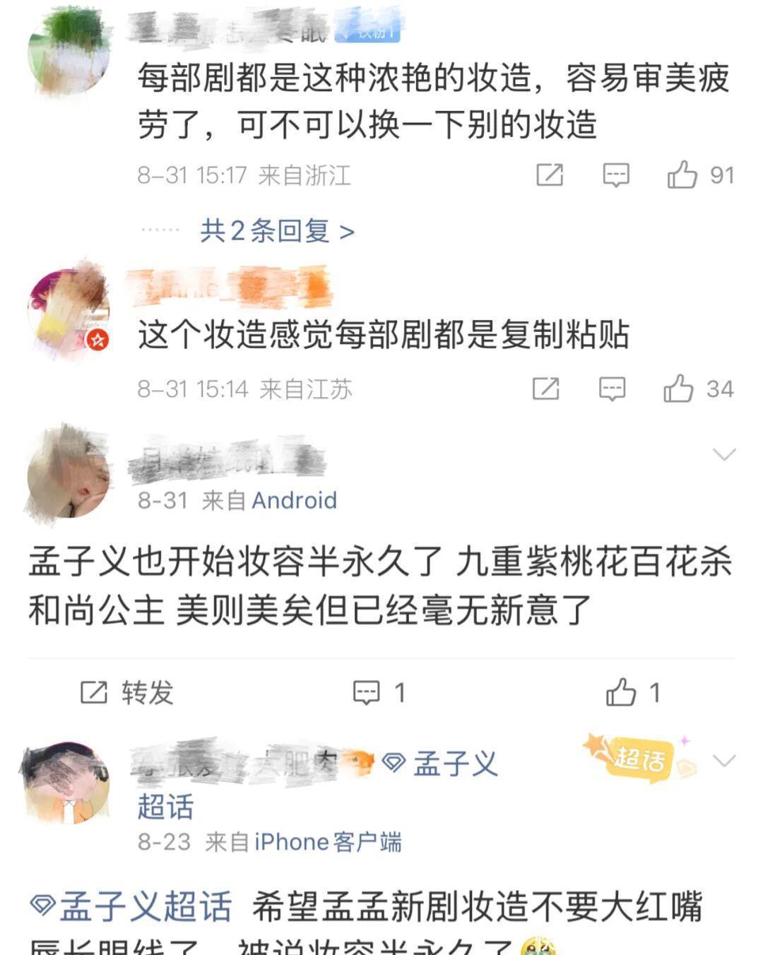 针对妆造问题,部分孟子义的粉丝写小作文并对职责室提倡建议,只不外从咫尺的路透来看,剧方似乎莫得接收,她依旧是“妆容三件套”。