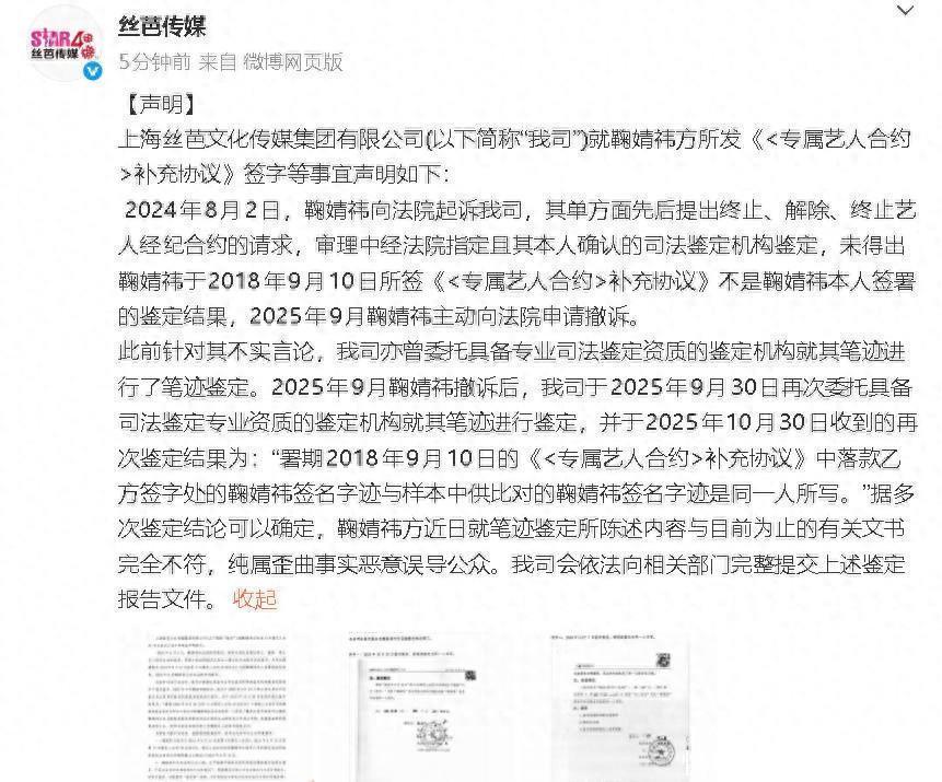 声明指出,此前法院两次拜托将强机构对《专属艺东谈主合约》补充公约中的 “鞠婧祎” 签名进行将强,效力均为 “无法判断是否本东谈主所写”,而丝芭传媒自行拜托机构得出的 “签名为本东谈主所写” 论断,既未获得规定机关招供,也与法院拜托的将强效力互异。