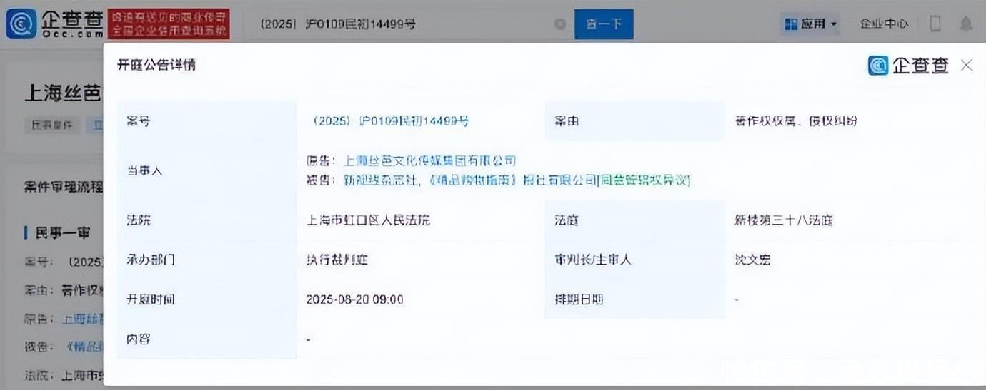 近日,字据企查查APP,法院公开上海丝芭文化传媒集团有限公司与新视野杂志社、《佳构购物指南》报社有限公司著述权权属、侵权纠纷一审裁定书。