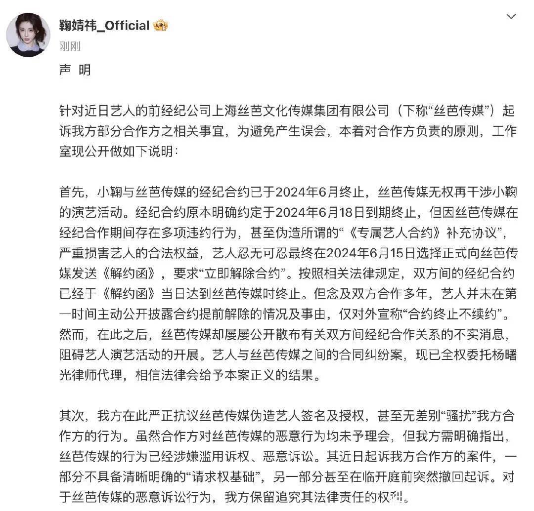 随后鞠婧祎发布声明,就前经纪公司丝芭传媒告状其勾通方一事作出修起。声明指出欧洲杯体育,鞠婧祎与丝芭传媒的经纪合约已于 2024 年 6 月 15 日远离 —— 原合约本应 6 月 18 日到期,因丝芭在勾通工夫存在多项爽约,伪造《专属艺东谈主合约》补充公约,鞠婧祎于 6 月 15 日发函解约,按法律设施合约当日即远离。 同期责任室控诉,丝芭传媒伪造艺东谈主签名及授权,以 “紊乱” 勾通方、分布伪善信息拦阻鞠婧祎演艺步履,近期告状勾通方的案件中,部分无明确苦求权基础,部分开庭前倏得撤诉,涉嫌铺张诉权、坏心诉讼。 责任室强调,2024 年 6 月 15 日后的勾通均由鞠婧祎本东谈主授权签署,正当有用,并暗示已拜托讼师处治与丝芭的合约纠纷,将根究对设施律连累。