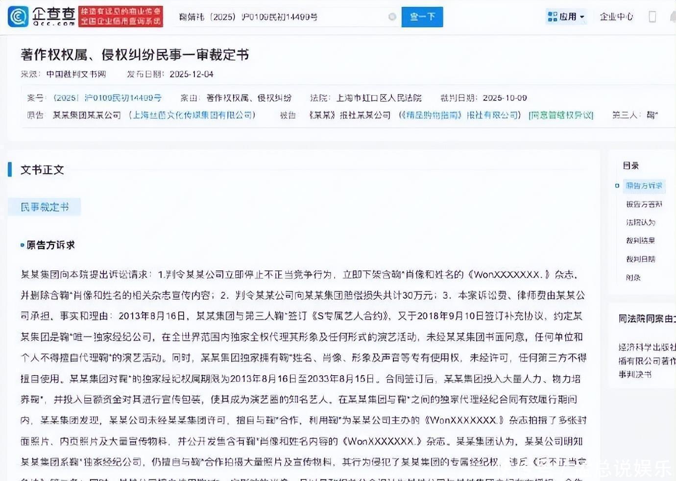 裁定书本质浮现,原告丝芭集团诉求:判令被告立即下架含鞠婧祎肖像和姓名的杂志并删除宣传本质;抵偿去世系数30万。