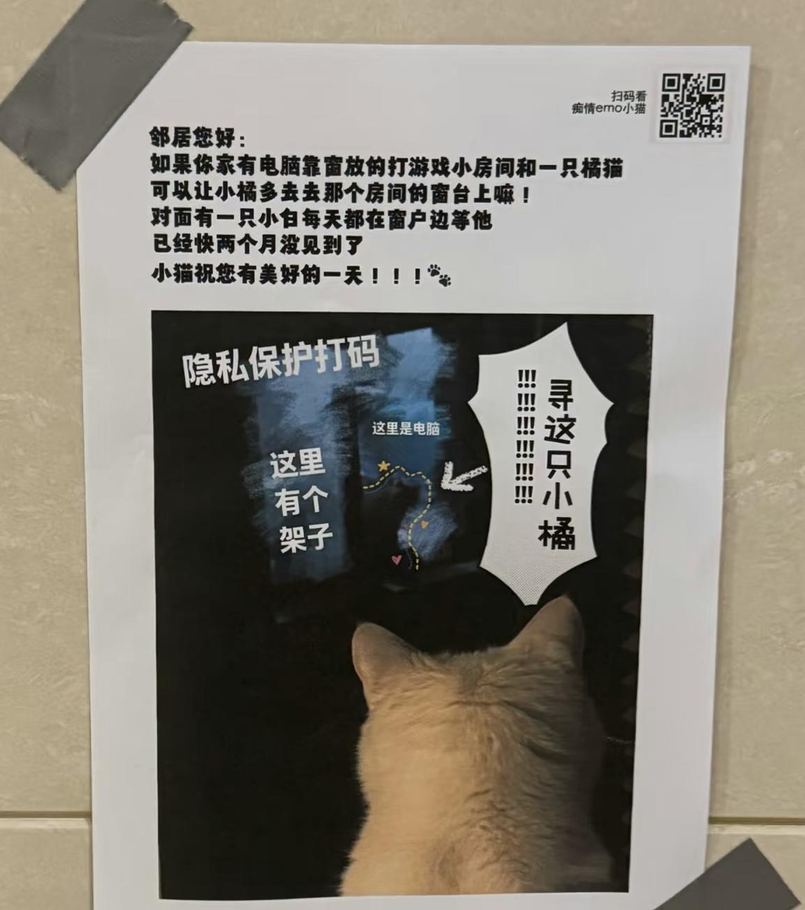 本来,小橘的家长一直没发现对面窗台上有只猫,她认为自家猫每天上窗台是思跳楼。