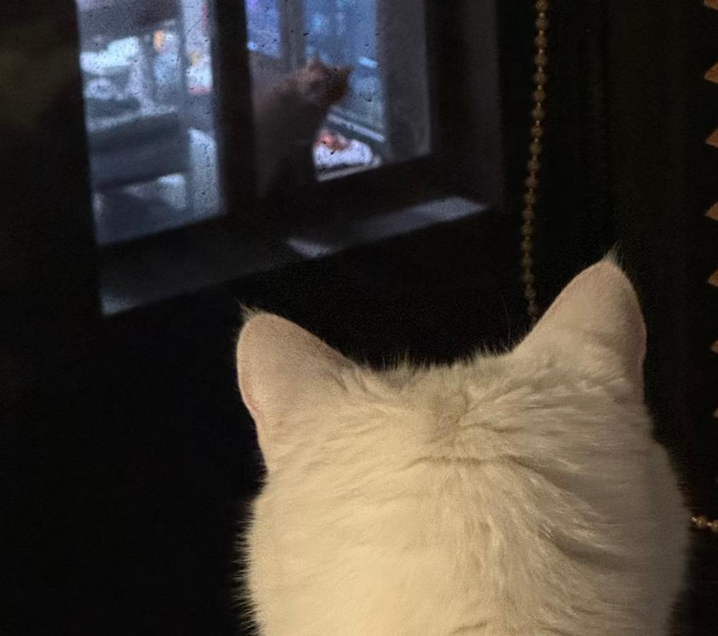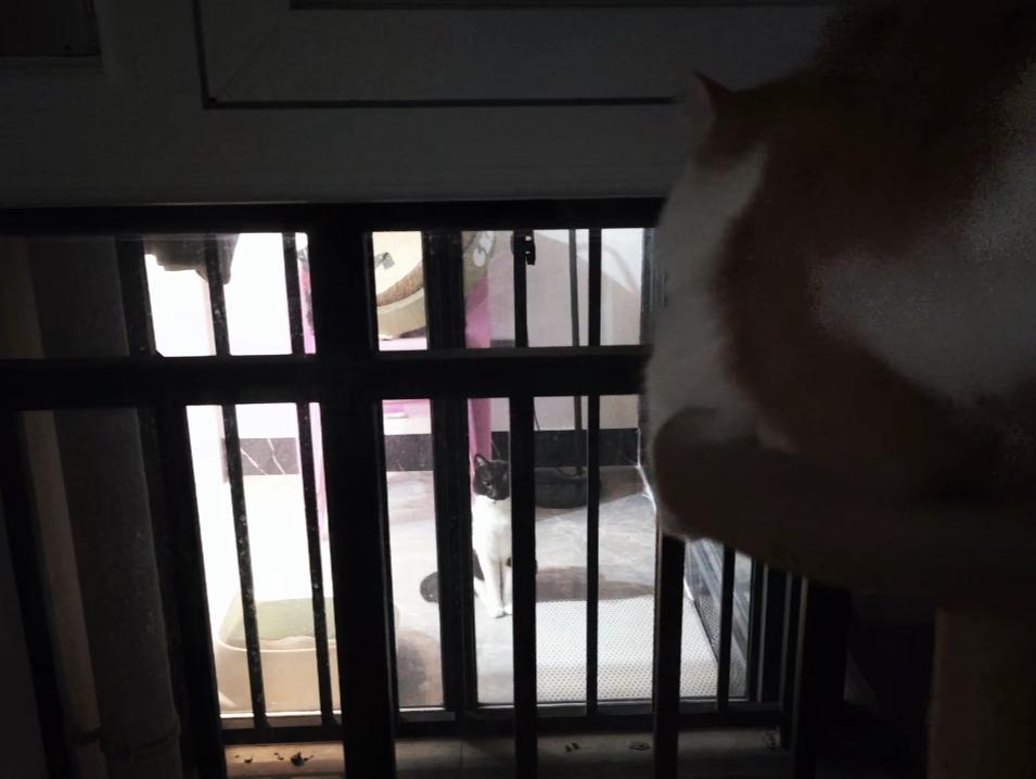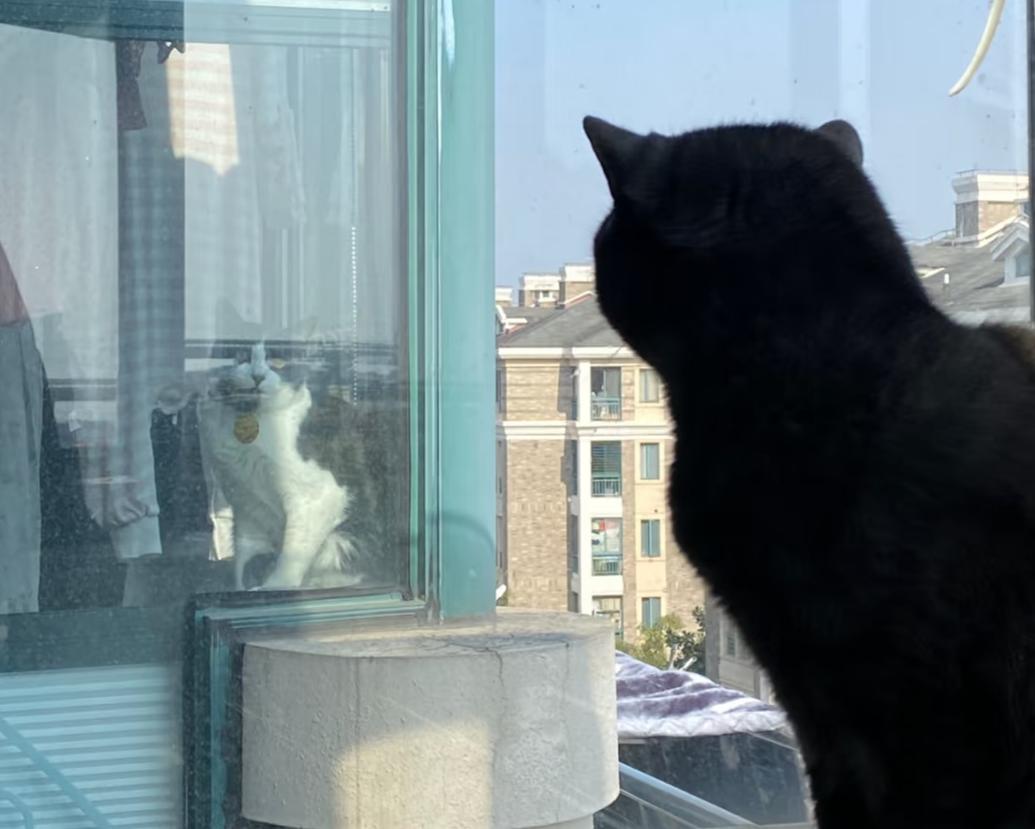大白在飘窗上看到了隔邻楼的小橘,两只猫你望望我,我望望你,尽然隔着窗户成为好一又咪。