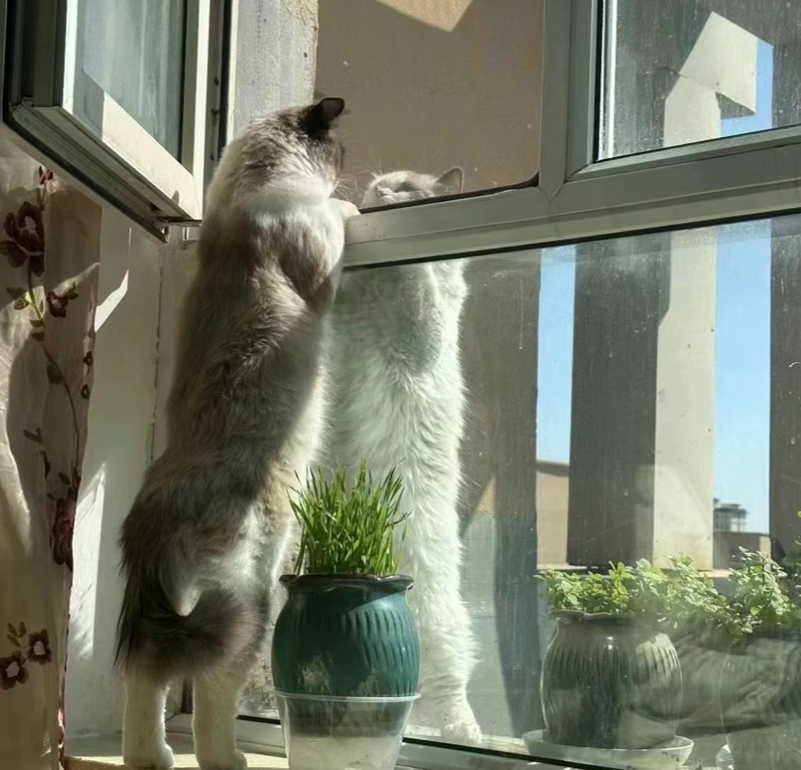 家住一楼,养了只布偶,前段本事窗外来了只流浪布偶,俩猫一见属意。