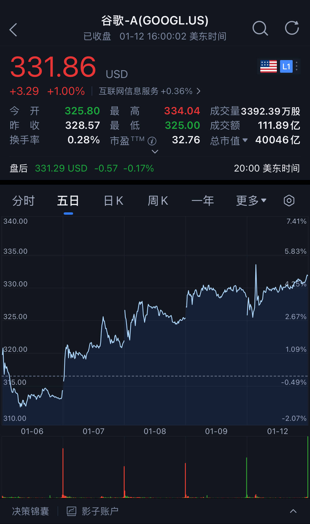 ▲谷歌近5日股价走势(图源:腾讯自选股)