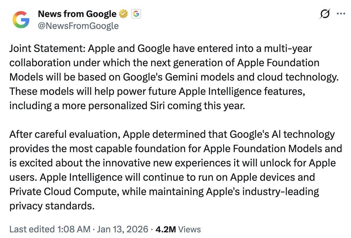 智东西1月13日报谈,当天凌晨,谷歌与苹果发布维持声明,两边就AI作事达成多年深度配合——苹果要依靠谷歌Gemini和云技艺来构建苹果的基础模子。蓝本在操作系统大战的两大巨头,在AI期间不测地走向交融。
