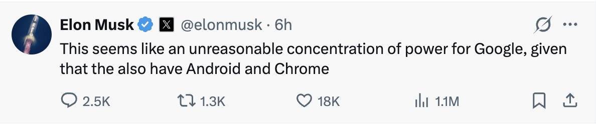 音讯仍是发布,马斯克跳出来在外交平台X直言:“斟酌到谷歌旗下还领有安卓和Chrome浏览器,这种权柄汇集似乎有些永诀理。”